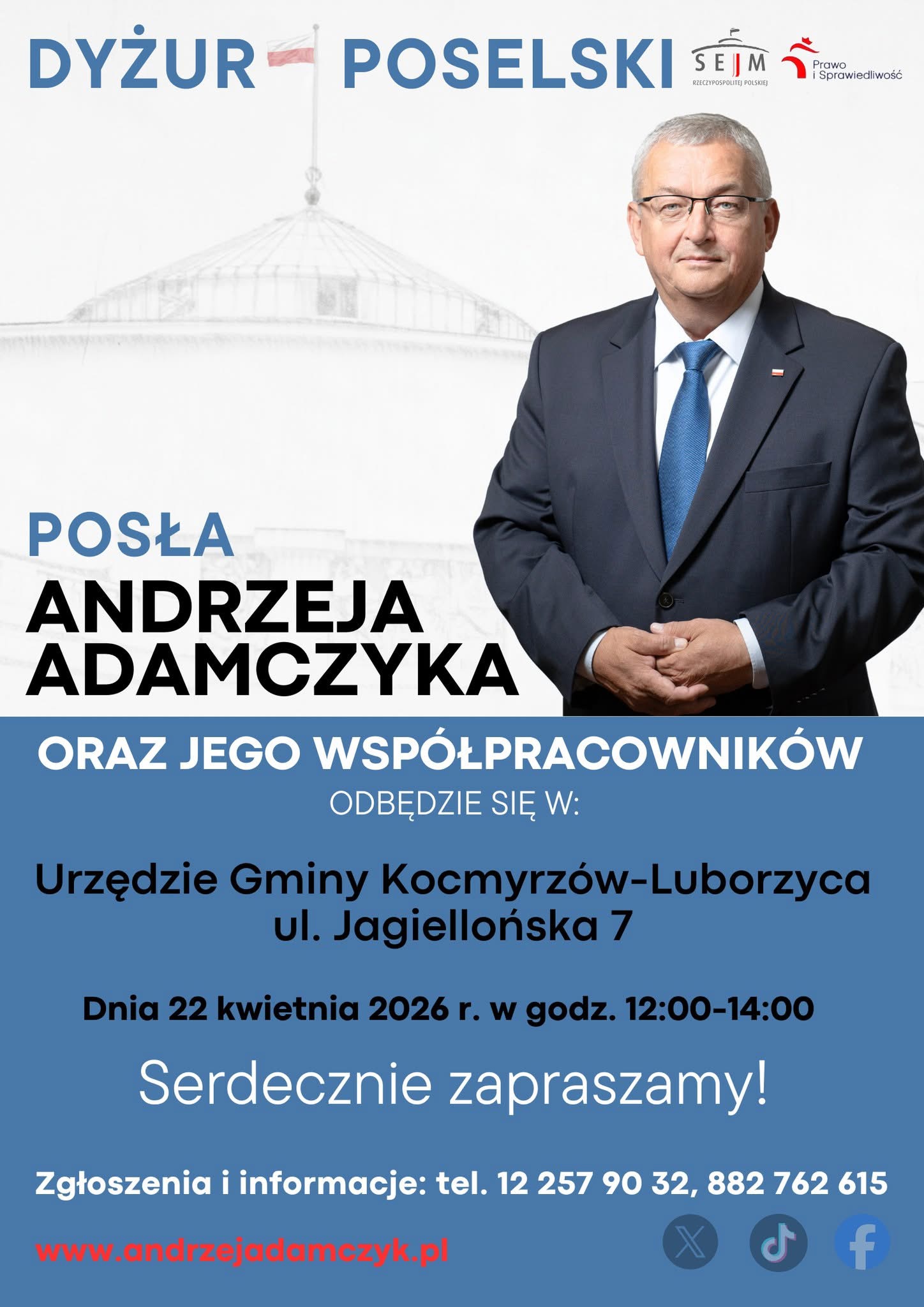 W imieniu posła Andrzeja Adamczyka zapraszamy na dyżur poselski w Urzędzie Gminy Kocmyrzów-Luborzyca w dniu 22.04.2026r.