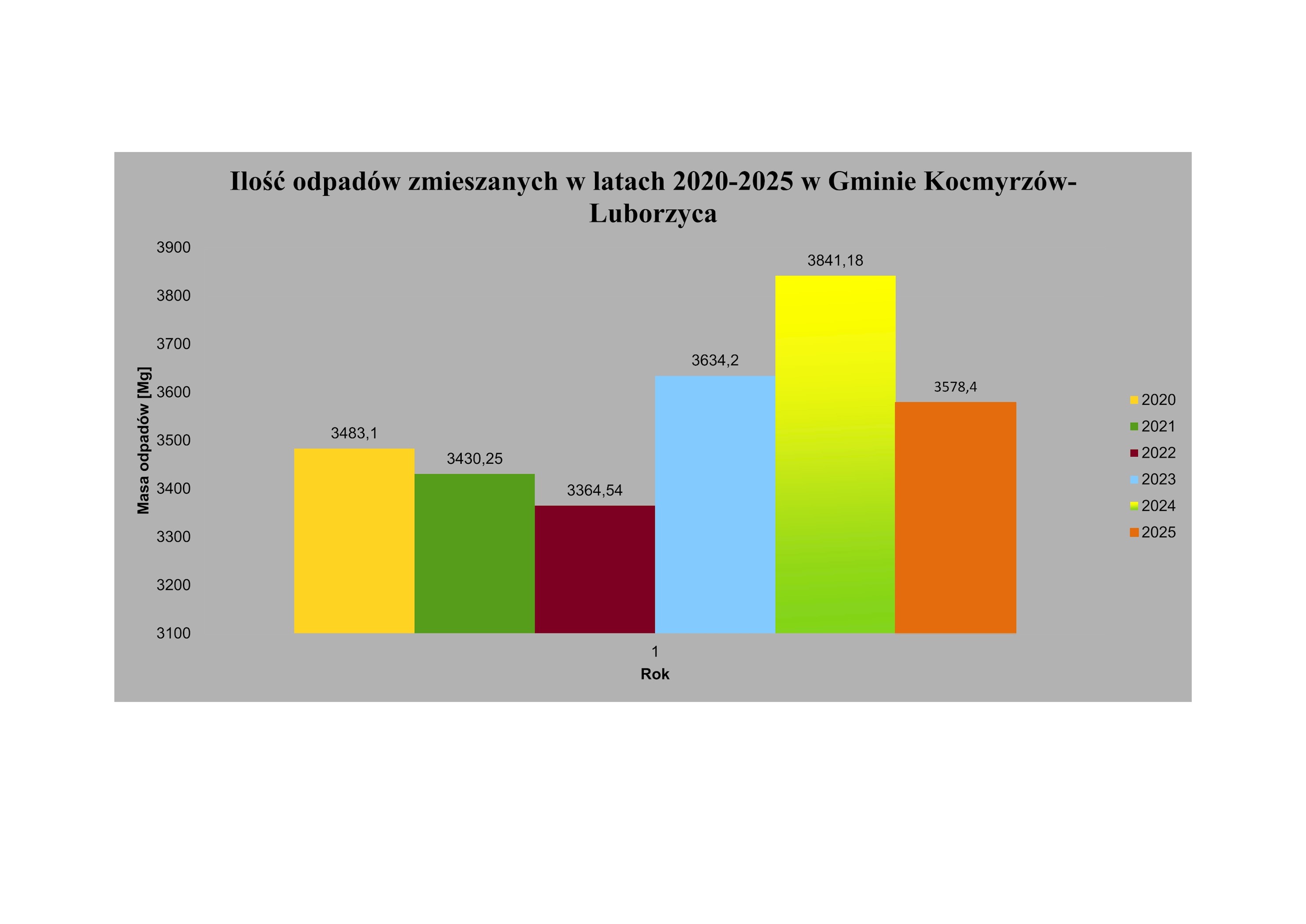 Zeszłoroczne dane zamieszczone poniżej, wykazują wzrost ich ilości w zakresie nieomal każdej frakcji. Wyjątkiem jest zmniejszenie masy śmieci zmieszanych. Powodem tego stanu rzeczy może być, lepsza segregacja odpadów w gospodarstwach domowych, na co wskazuje równoległy wzrost masy odpadów zbieranych selektywnie. Jednakże należy mieć świadomość, iż ta sytuacja może być spowodowana wyodrębnieniem od stycznia ubiegłego roku dodatkowej frakcji odpadów o kodzie 200110 - tekstylia, które w latach poprzednich ewidencjonowane były wraz z odpadami zmieszanymi. Bez względu na realną przyczynę ww. zmiany, na pewno istnieje potrzeba kontynuowania działań edukacyjnych w zakresie prawidłowej segregacji odpadów już u źródła czyli w naszych domach.